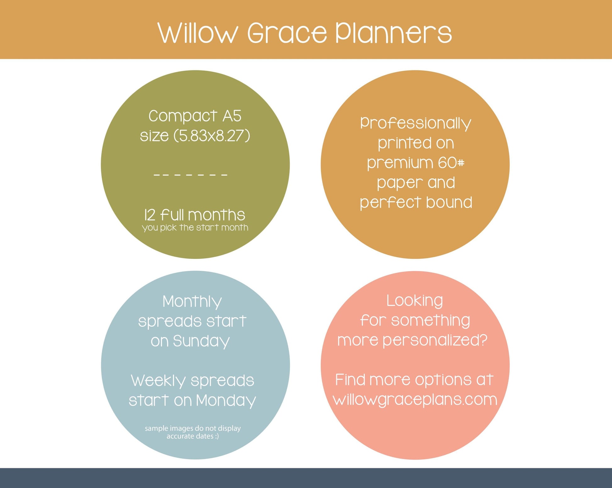 Stay organized and inspired all year long with Willow Grace Planners. Designed for those who value both beauty and functionality, these planners are professionally printed and ready to ship. Looking for something more personalized? Check out WG custom planners!