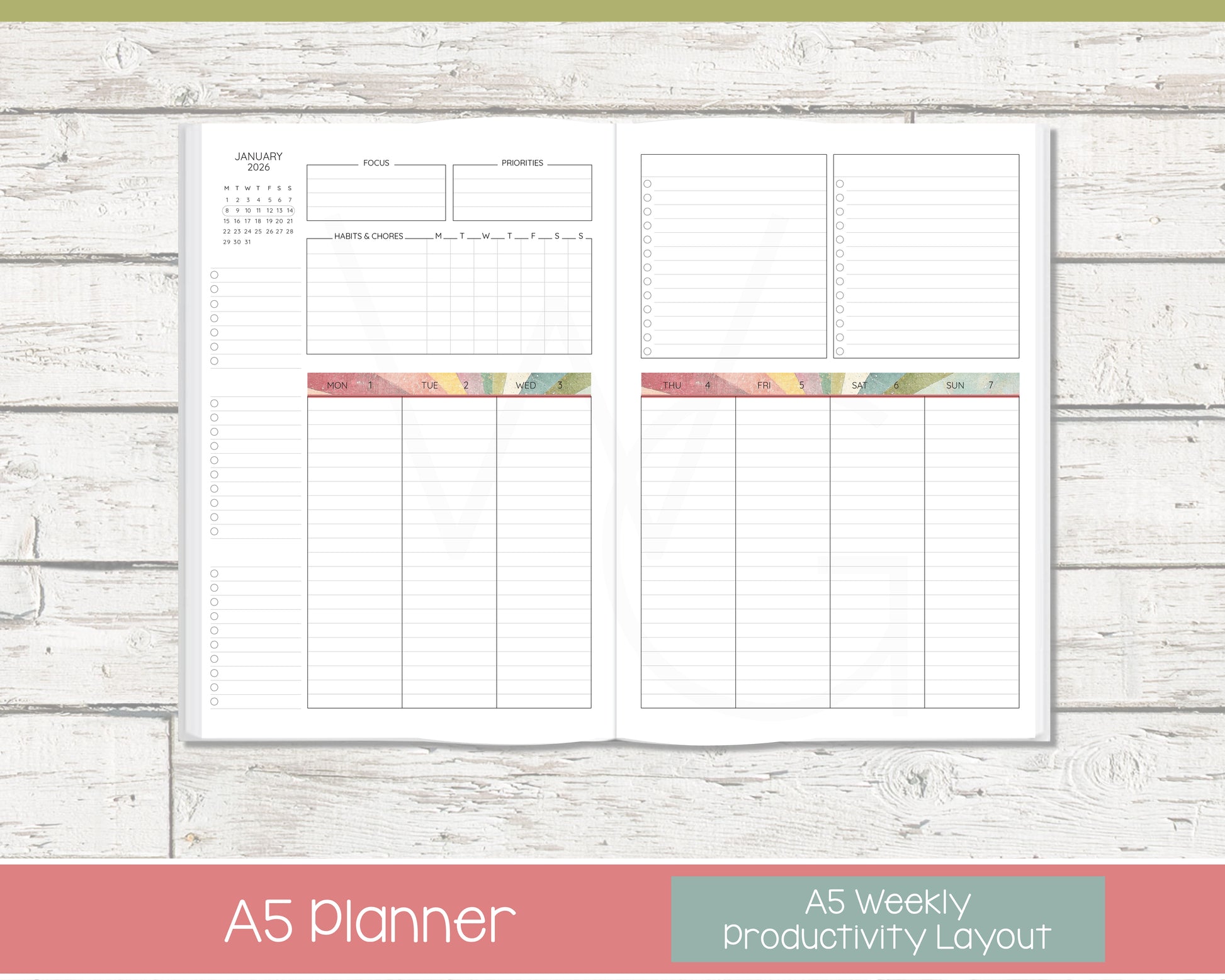 Pages: Monthly layout, weekly layout, daily layout, note pages