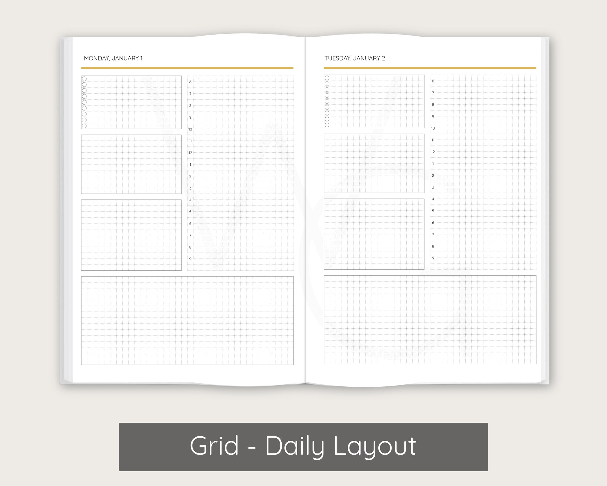 Planner setup is grouped by month. For example, a planner that begins in January will have January monthly layouts, January weekly layouts, January daily layouts followed by February's layouts.