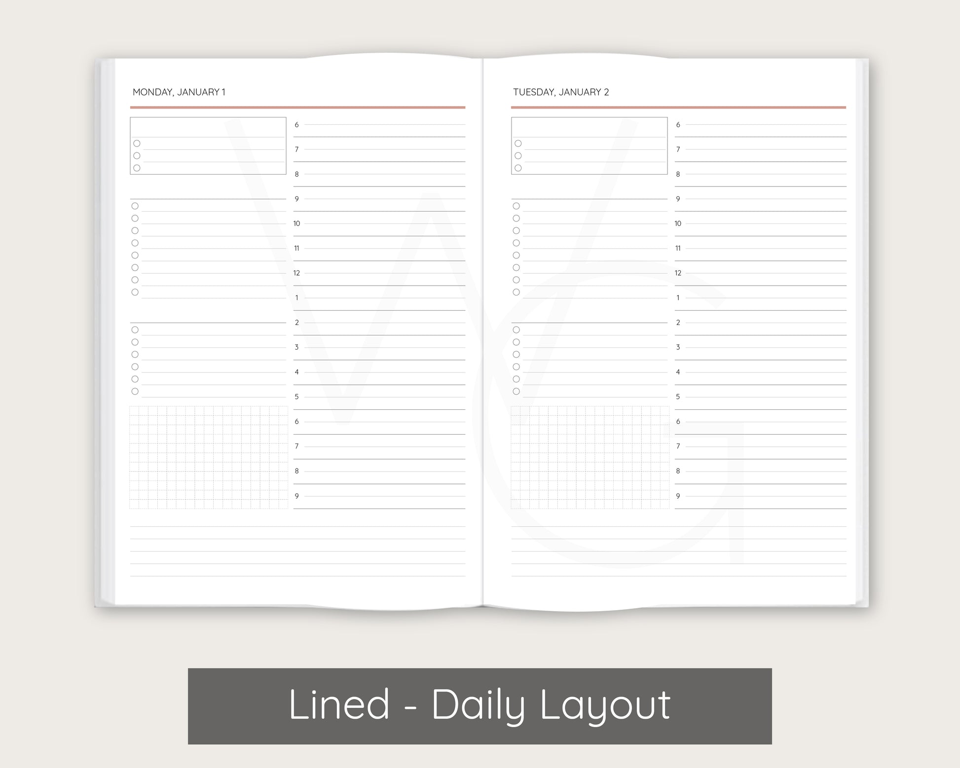 Planner setup is grouped by month. For example, a planner that begins in January will have January monthly layouts, January weekly layouts, January daily layouts followed by February's layouts.