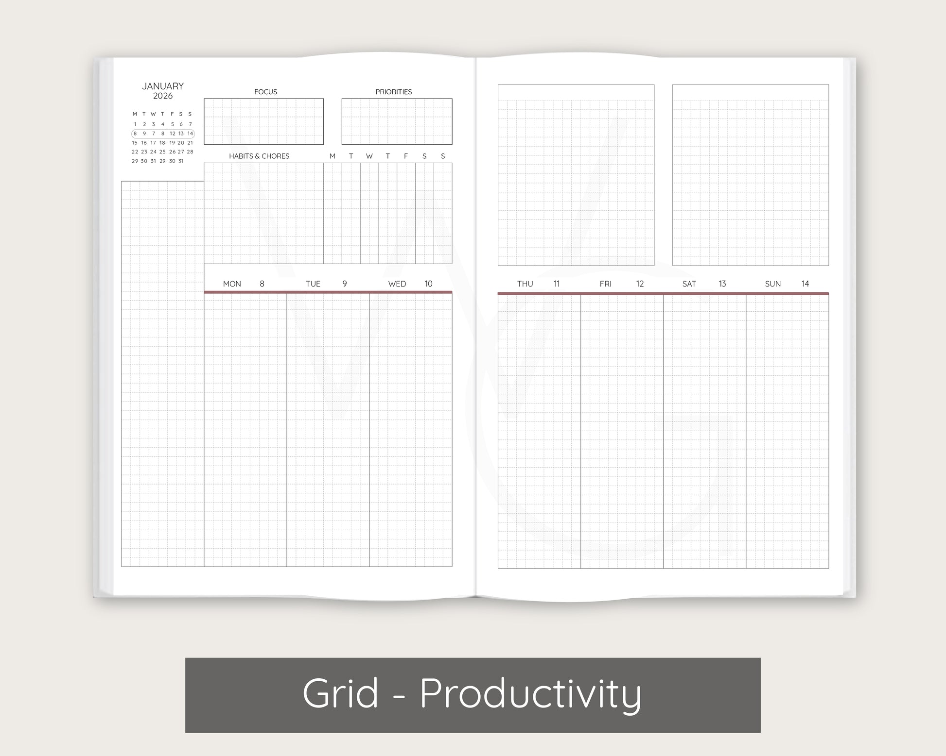 Planner setup is grouped by month. For example, a planner that begins in January will have January monthly layouts, January weekly layouts, January daily layouts followed by February's layouts.