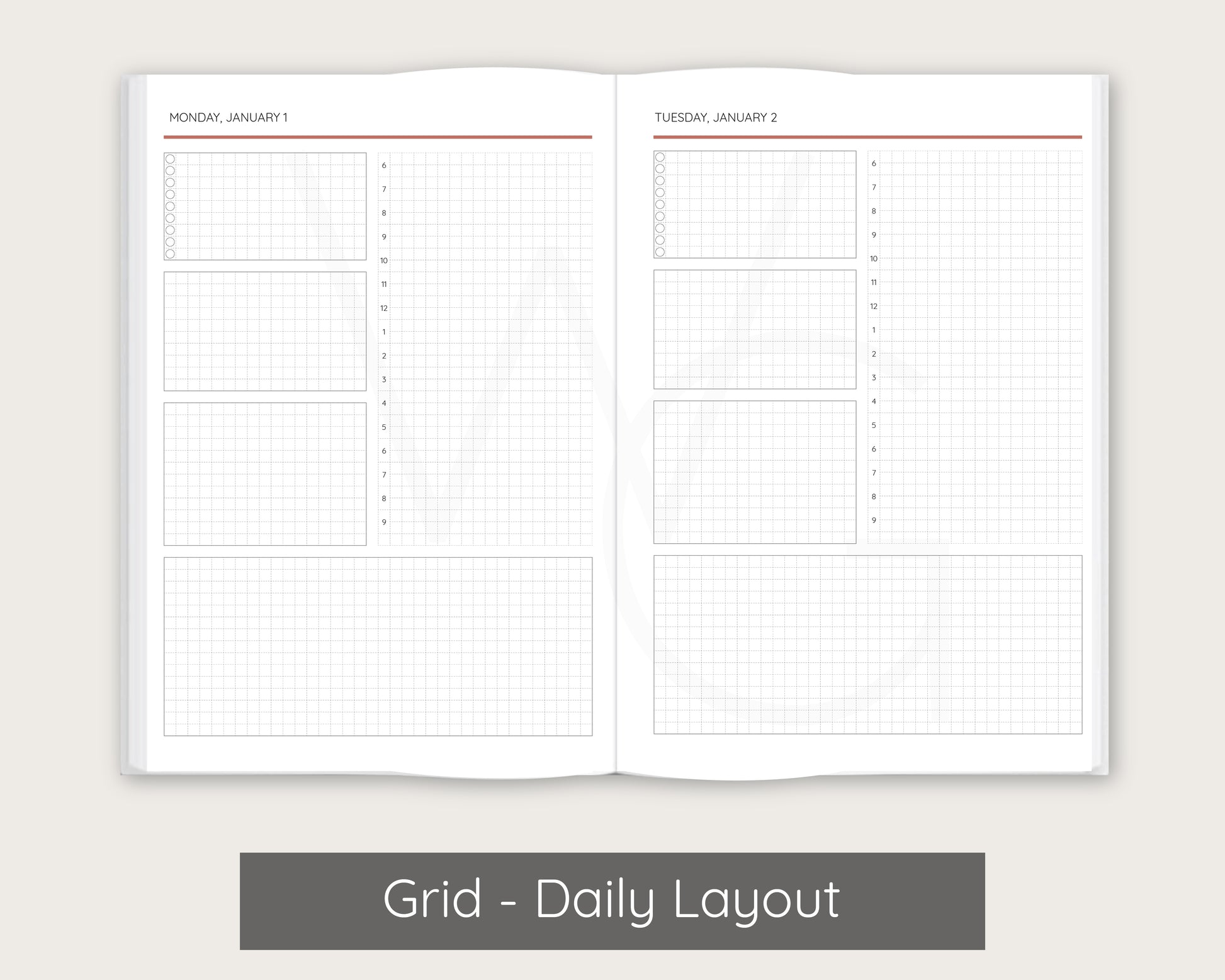 Planner setup is grouped by month. For example, a planner that begins in January will have January monthly layouts, January weekly layouts, January daily layouts followed by February's layouts.